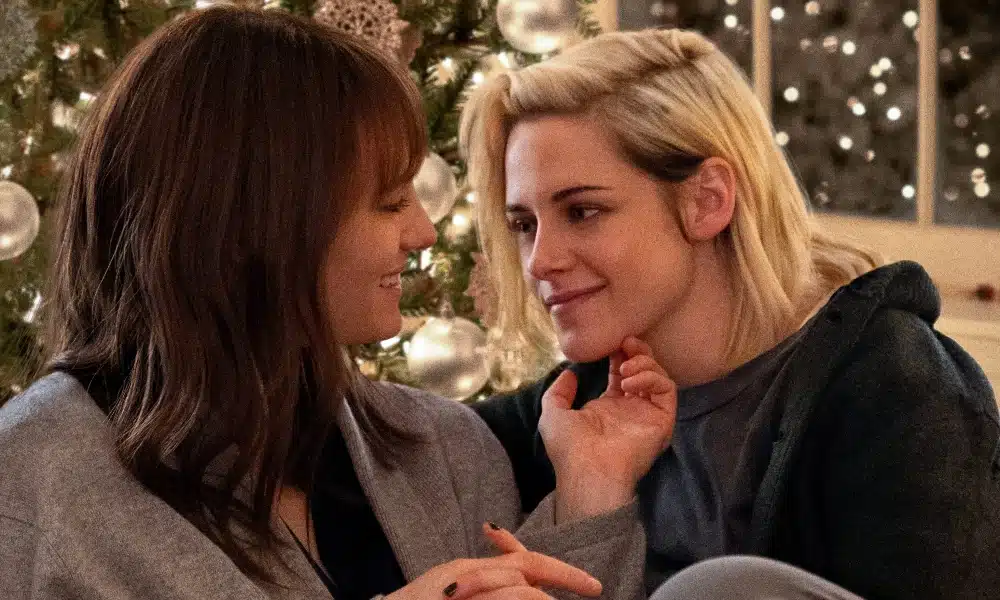 In the 2020 queer holiday movie Happiest Season, Abby (Kristen Stewart) and her girlfriend Harper (Mackenzie Davis) spend the holidays with Harper’s family even though they don’t know she’s queer. To heat things up, the chemistry between Abby and Harper’s ex, Riley, played by Aubrey Plaza, is off the charts!