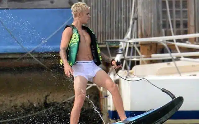 He really does do everything in his Calvins. Bad boy, Justin Beiber, is showing off … again. This time, the 22-year-old former singer, current stripper, can be seen wakeboarding while wearing nothing but his white Calvin Klein boxer-briefs. What a tease!