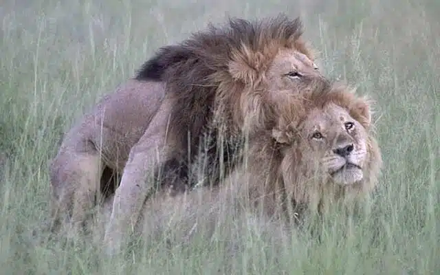 Talk about gay Pride — and they say homosexuality isn’t natural.A tourist on safari photographed two male lions doing (what looks like) the thing they’re supposed to be doing behind closed trees. Thank God for smart phones.