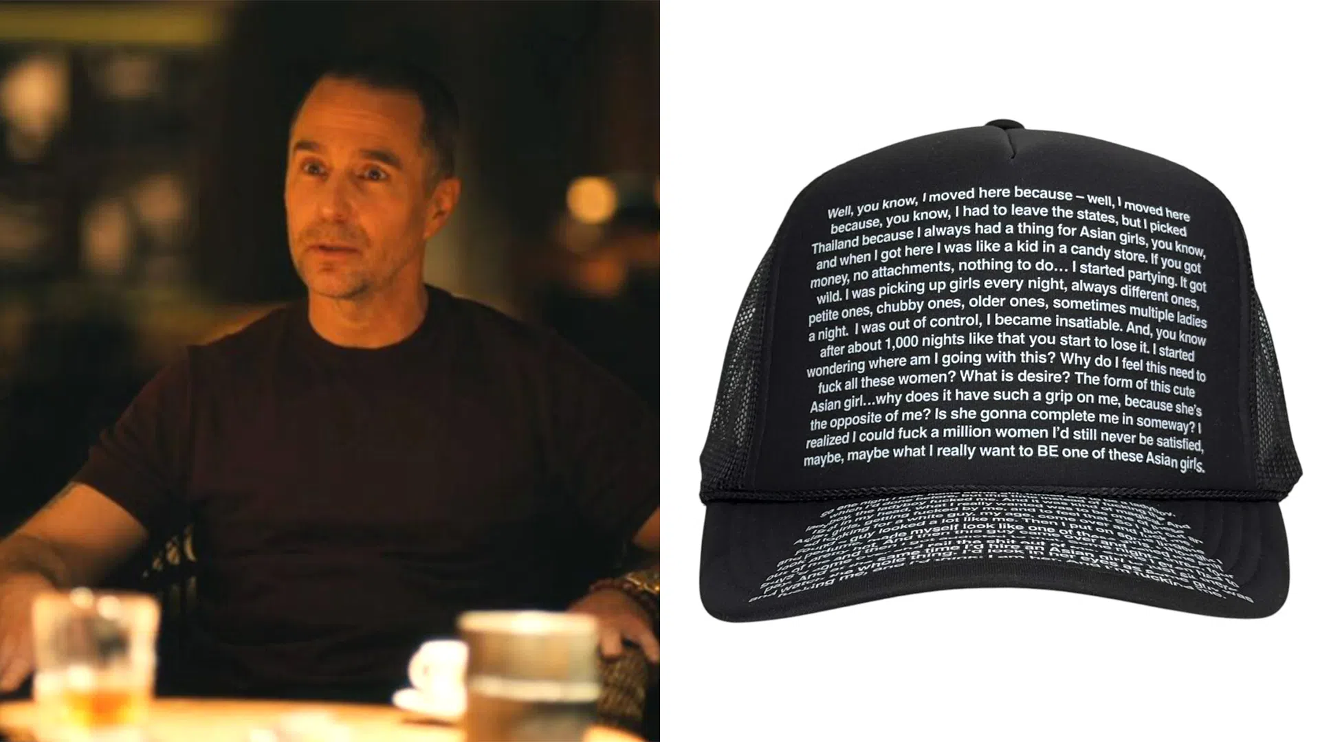 TheGoodShirts.com, an online store, is selling a black trucker hat featuring the full monologue printed in white type on the front panel and down the bill. The design includes the segment where Rockwell’s character describes wearing lingerie, finding men who resemble him, and engaging in sexual activity while looking at an Asian woman.