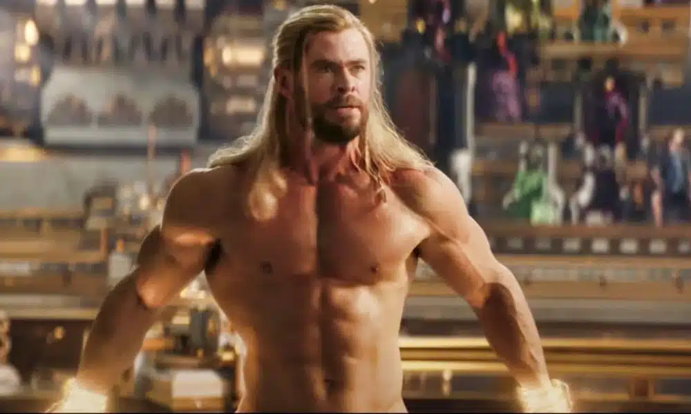 Thor: Love and Thunder follows the god on a journey of self-discovery. We know this includes a fitness journey as Thor gained weight during Avengers: Endgame. Why not show off his new bod, right?