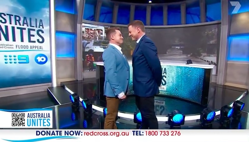 Do the ends justify the means? That is the question we’re asking ourselves after watching this clip. During a live fundraiser for the Red Cross, two straight Australian TV hosts made out for a $50,000 donation. The fundraiser, called Australia Unites, was held to raise funds for flood victims. Last month floods in eastern Australia, the worst in the country’s history, have killed at least 22 people and cost at least $2.5 billion in damage.